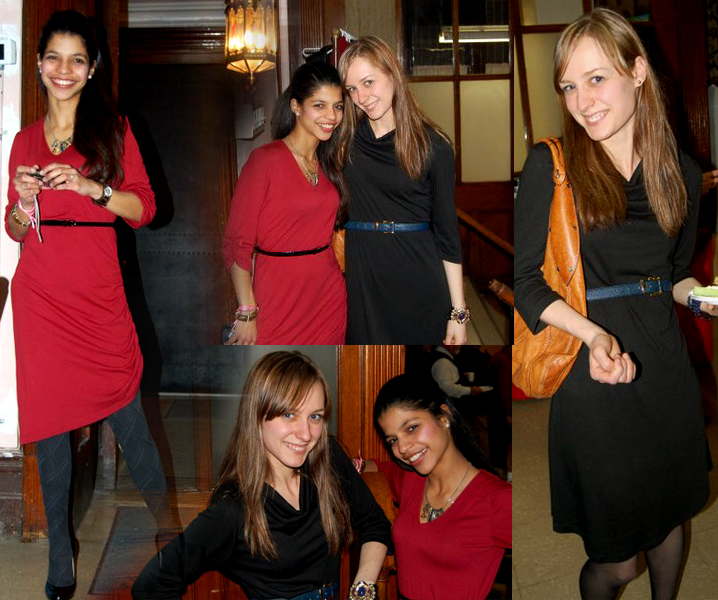 Meet my friend, Eva (in red dress). We had a Christmas celebration at church, and we decided to wear 2 of Elegantees' beautiful jersey dresses. We are young and hip so we cinched a belt around our waists. The length is just above the knee so it's modest to wear in everyday life. But do you ever feel the need to be a little conservative for church? I do! Eva wore patterned leggings, and I wore nylon pantyhose. An easy way to respect your elders. So modest and chic!